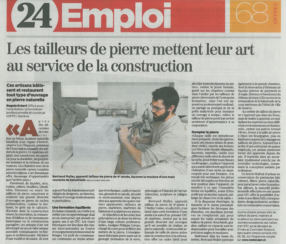 Tailleurs de pierre, marbriers et sculpteurs sur pierre seront présents avec 30 autres artisans d’art au Bâtiment des forces motrices (BFM), transformé en lieu d’exposition et de démonstrations à l’enseigne des Journées européennes des métiers d’art 2017. Celles-ci se déroulent simultanément dans 19 pays et dans quatre cantons romands (GE, VD, NE, JU), du 31 mars au 2 avril. Cette 6e édition genevoise offre au public l’occasion de découvrir les multiples talents que recèle l’artisanat d’art régional et de rencontrer des professionnels d’exception dans les ateliers, manufactures, coulisses de salles de spectacles, centres de formation et écoles d’art. La manifestation est gratuite.